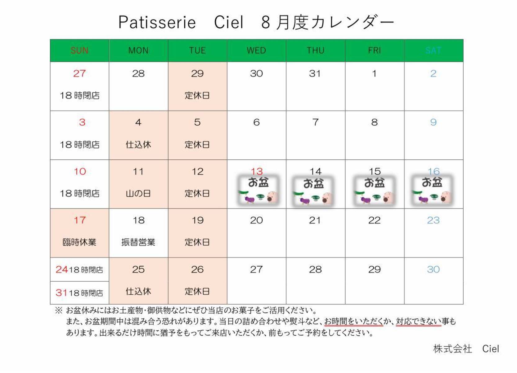 8月度営業カレンダー